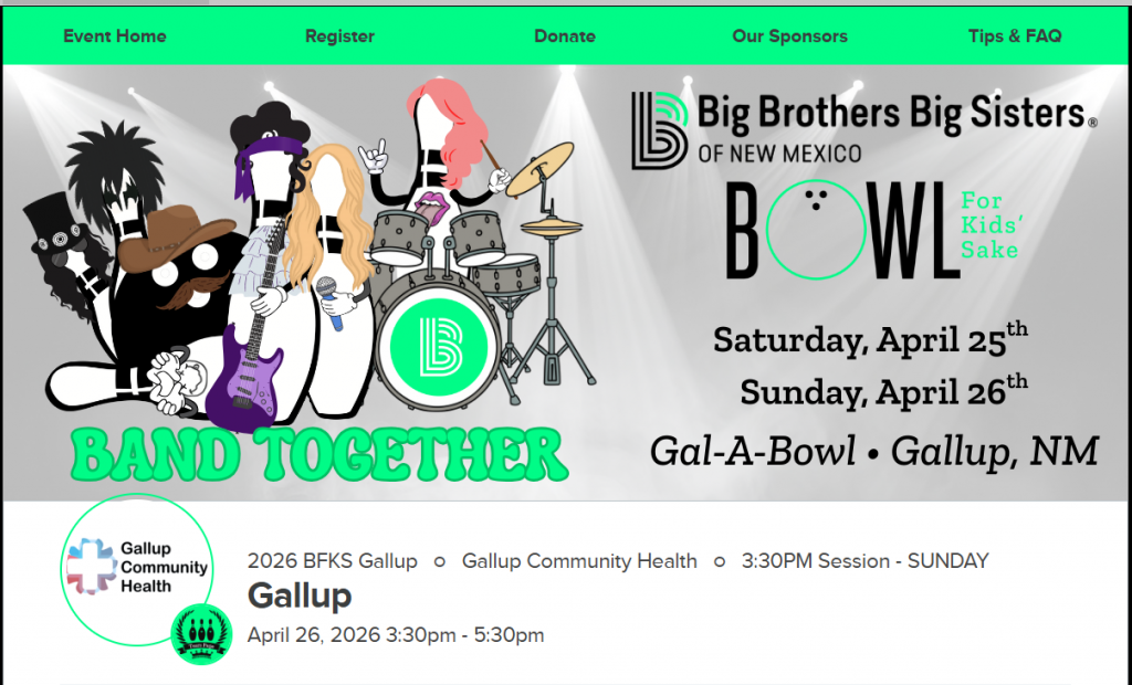 GCH + Big Brothers Big Sisters By GCHadminFebruary 18, 2026Community Events Help support the Gallup Community Health team raise money for Big Brothers Big Sisters of New Mexico in this year’s Bowl For Kids’ Sake. Info and donations here: 2026 BFKS Gallup